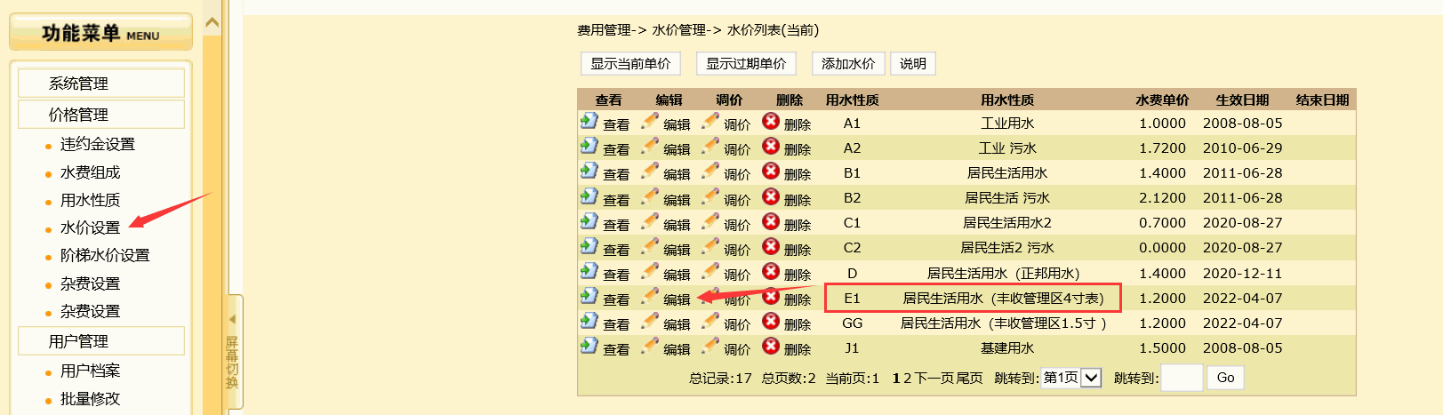 3、返回水价设置,选择刚刚新增的水价,编辑阶梯水价设置,如下图