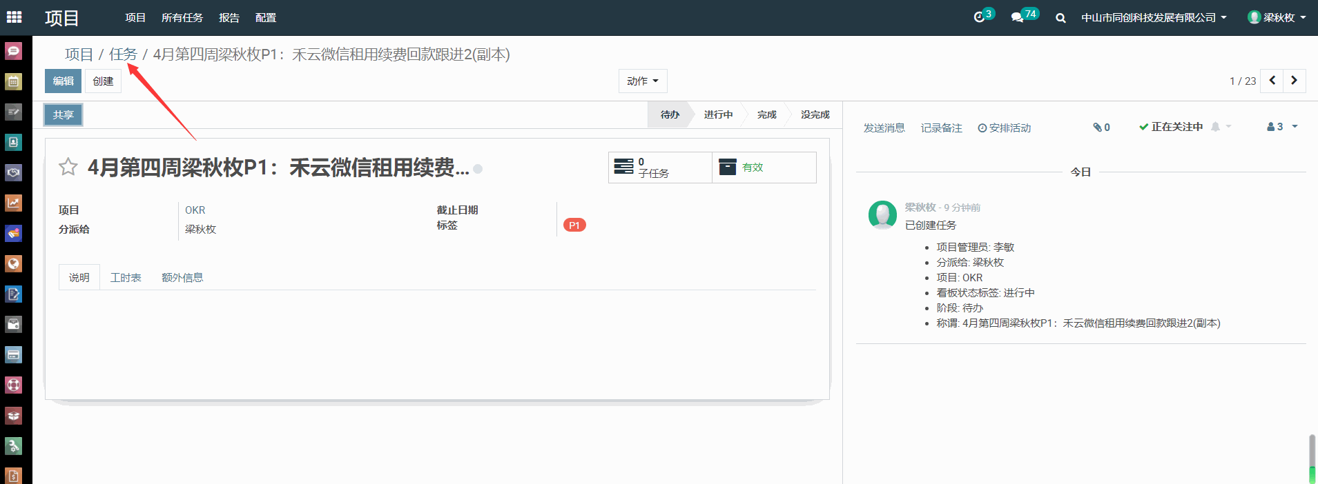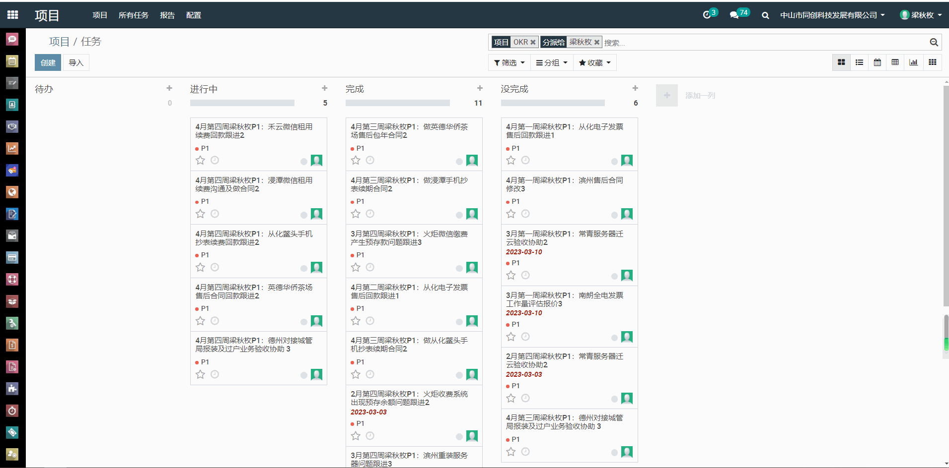 1、 进入ERP---项目---OKR,搜索栏输入自己的名字,例如输入:梁秋枚,选择“分派给为:梁秋枚”,搜索出自己的P1任务