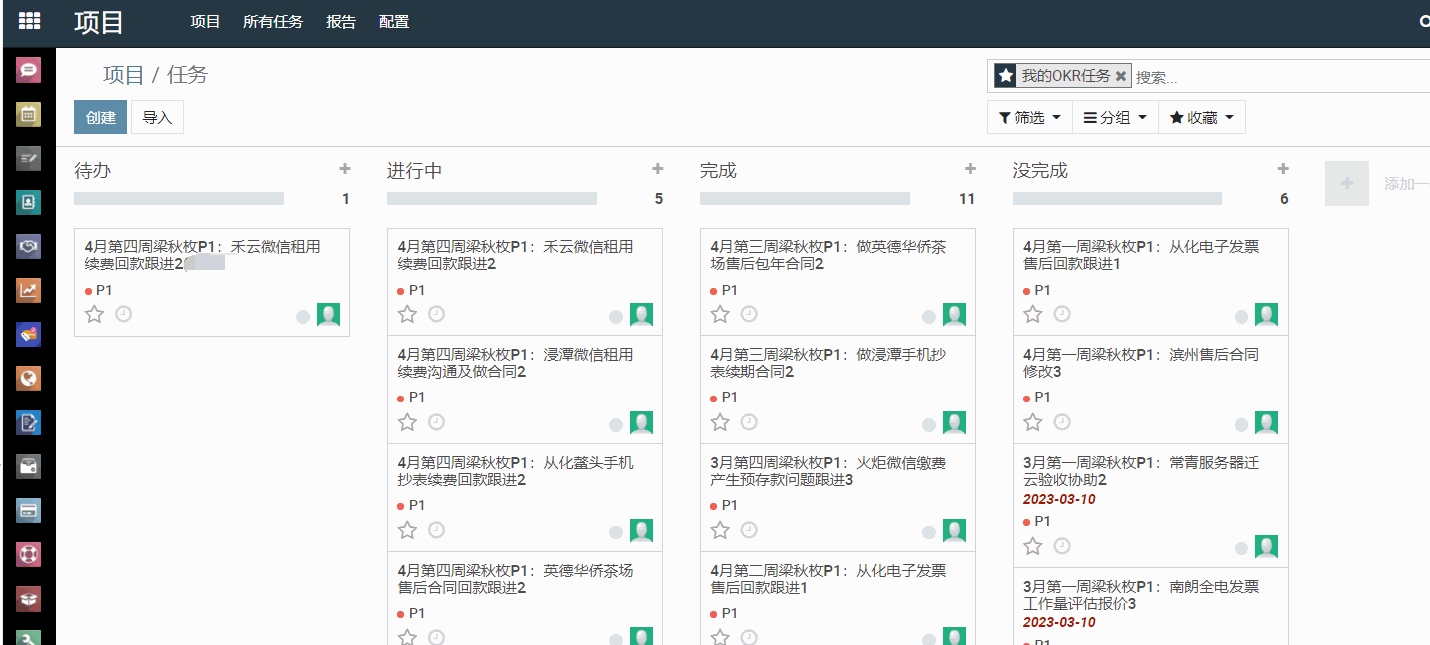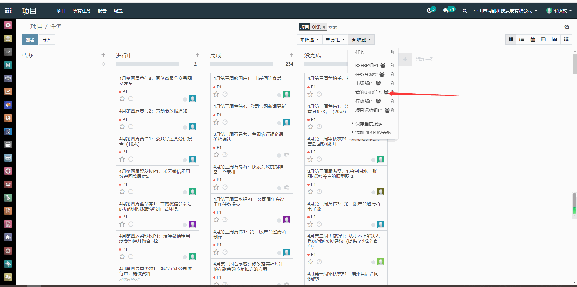 3、每周五上午12点前,要录入P1时,直接进入ERP---项目---OKR,点“收藏”,选择“我的OKR任务”即出现自己名下的所有P1任务