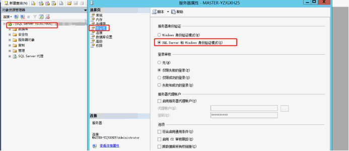 新建登录名后,右键选择数据库属性-安全性,选择sql server 和windows身份验证模式。